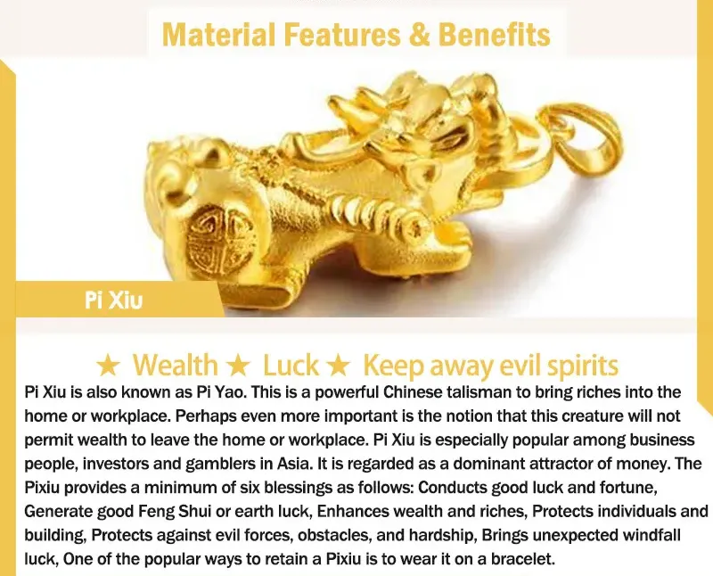 The Pixiu provides a minimum of six blessings as follows:Conducts good luck and fortune, Generate good Feng Shui or earth luck, Enhances wealth and riches, Protects individuals and building, Protects against evil forces, obstacles, and hardship, Brings unexpected windfall luck.