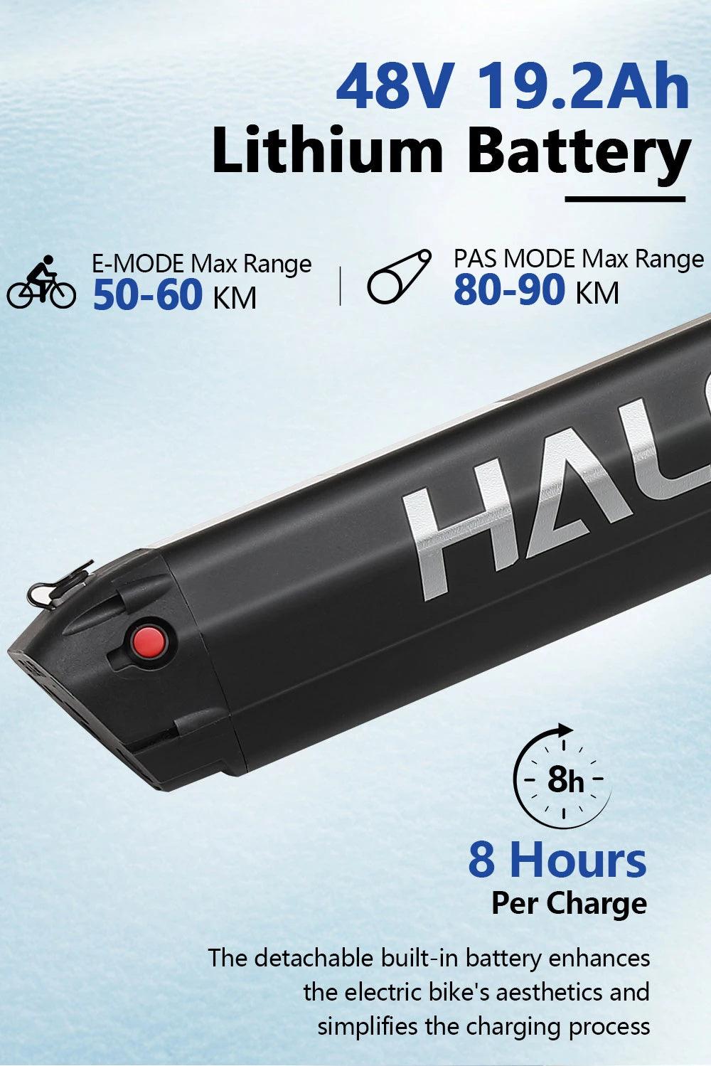 4. Removable 48V19.2Ah lithium battery, with a cruising range of 50-60 km in pure power mode and 80-90 km in pedal assist mode, which is very suitable for long-distance travel.