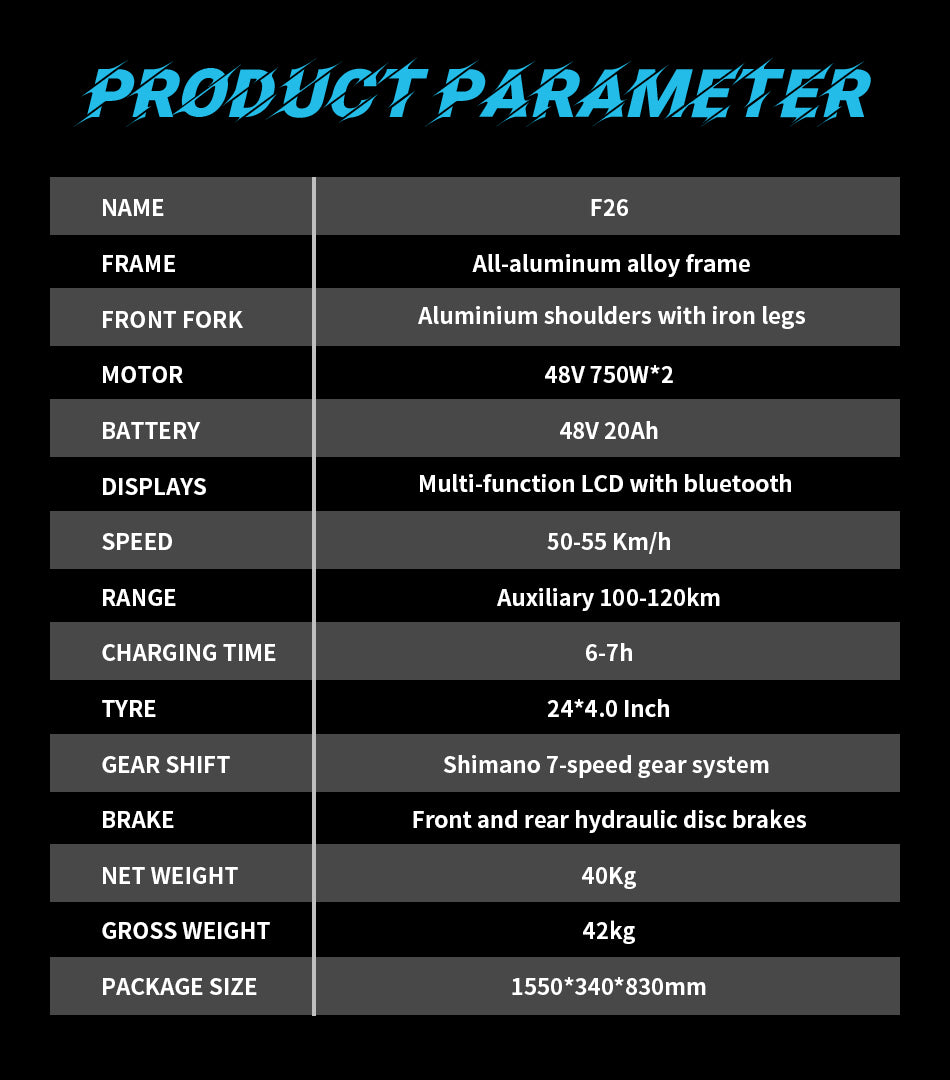 • Tire: 26*4.0 fat tires
