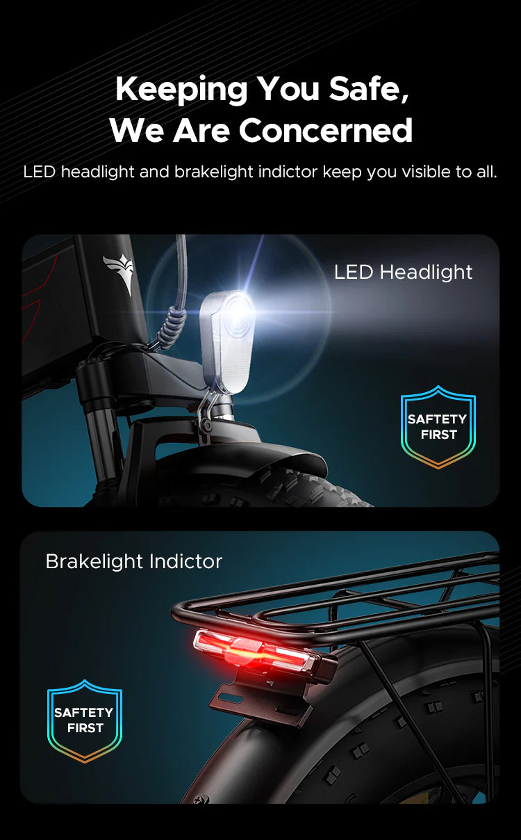 The E-bike adopts an excellent aluminum alloy frame, high toughness, and strong corrosion resistance feature. The front fork is made of high-strength carbon steel and packed with premium comfort shock absorption. With the lightweight and efficient design, the Aluminum alloy 20-inch wheel is suited to both urban and trail environments.