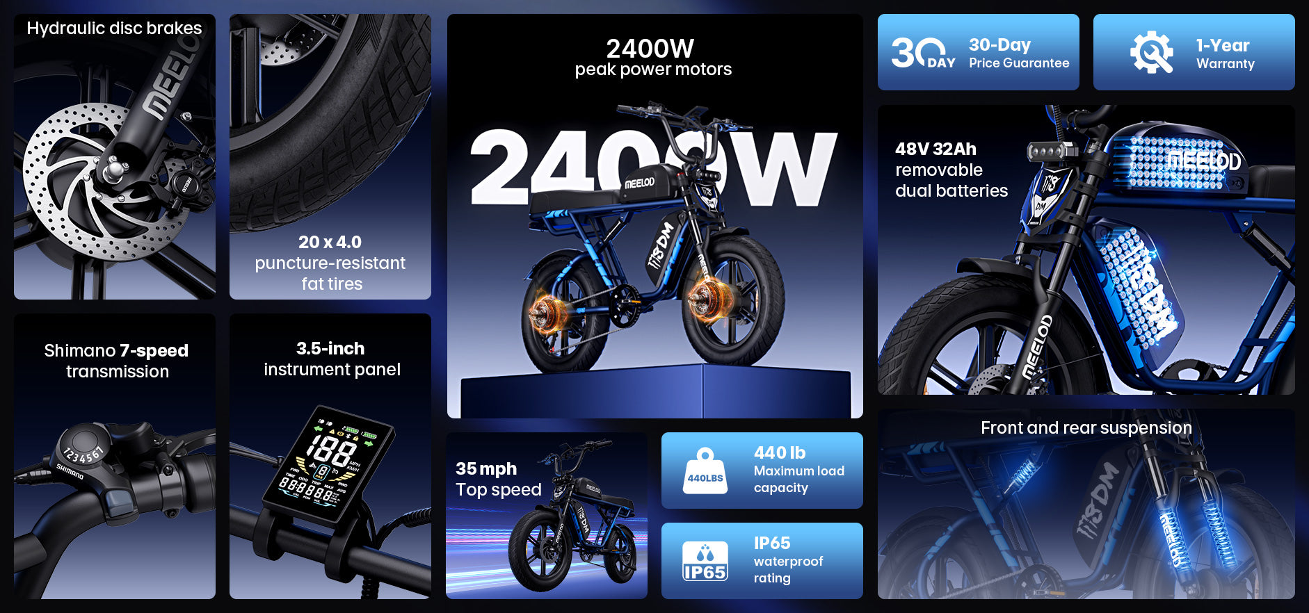 MEELOD M8DM 20" Retro Moped Style Electric Bike 1200W*2 Dual Motors 48V 32Ah Battery