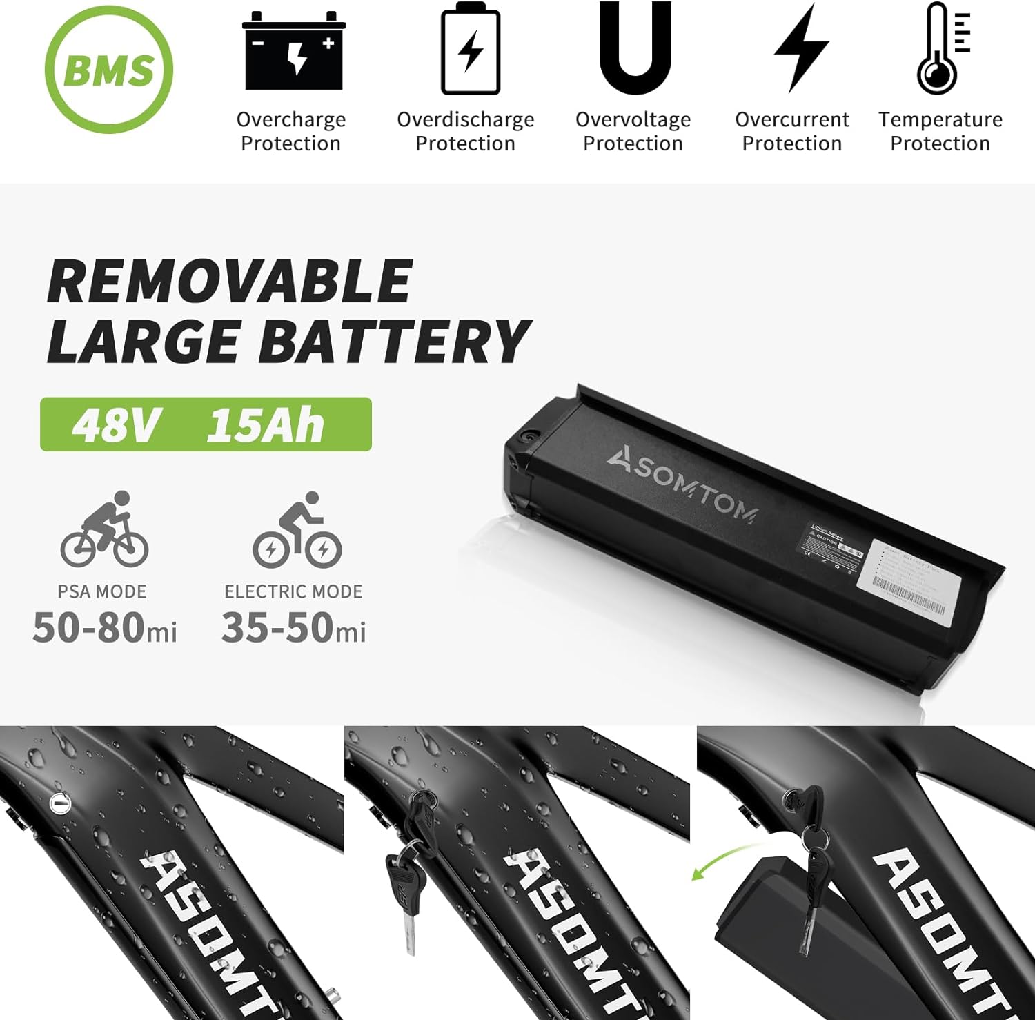 • Battery:48V 15Ah Removable Lithium-Ion Battery, 744Wh