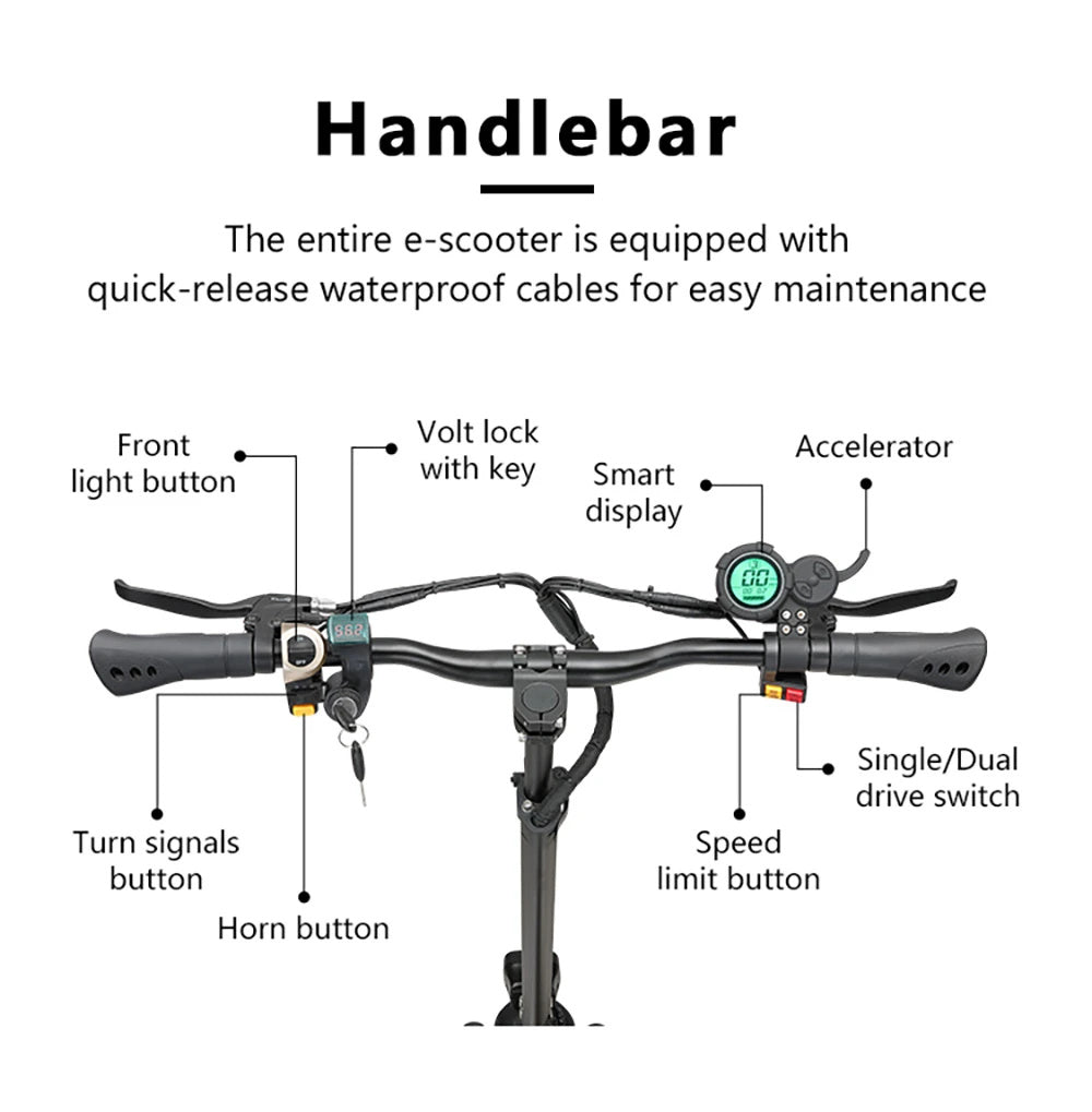 The scooter features a foldable frame and handlebar, making it easy to store and transport. It also has front and rear spring suspension for a smooth ride.