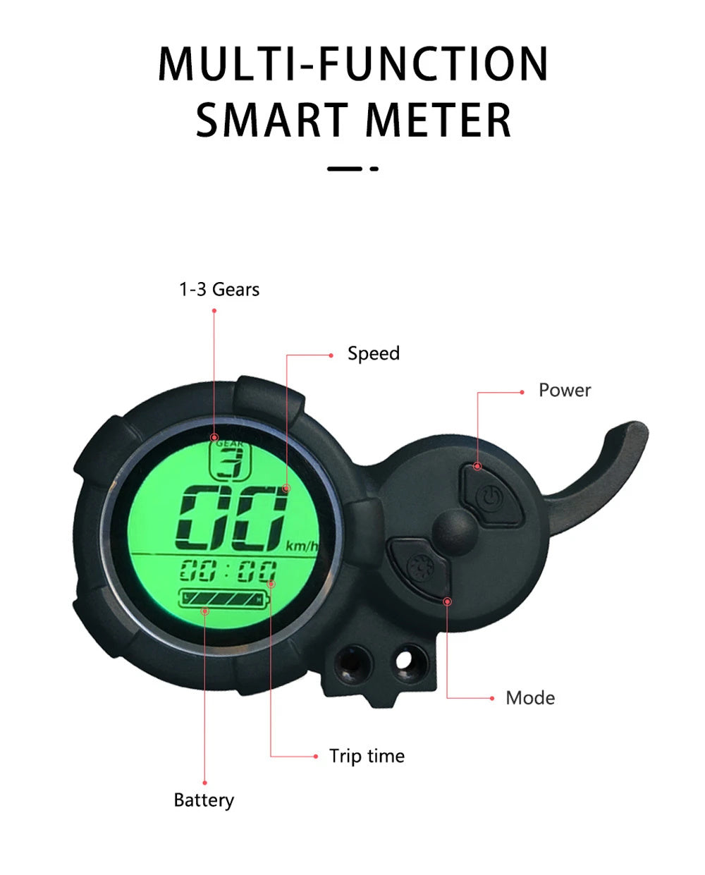 - Speed Level:Gear 1:25KM/H, Gear 2: 45KM/H, Gear 3: 65KM/H