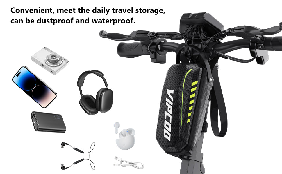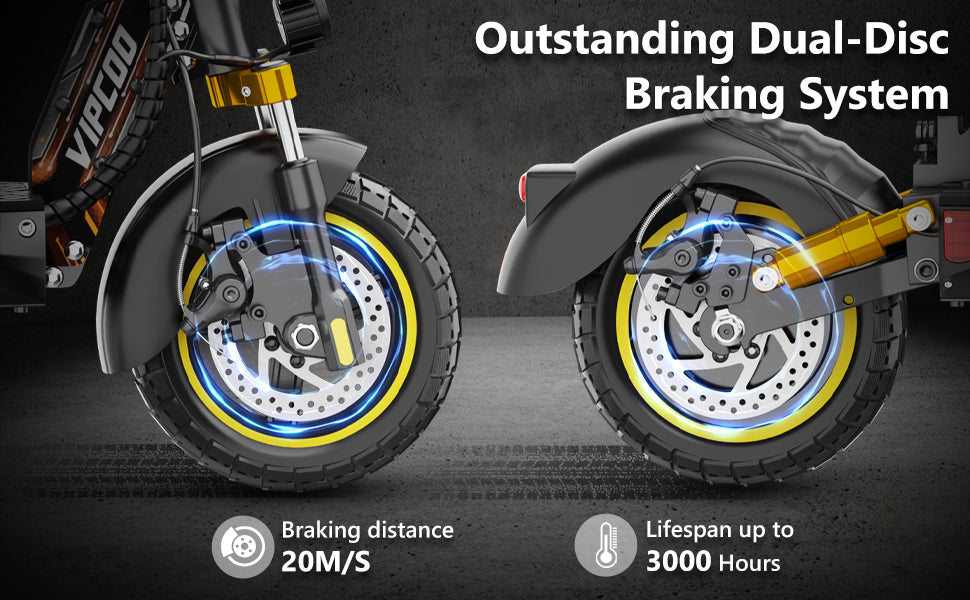VS1 eletric scooter tires with 10-inch pneumatic off-road tires, this tire is adapted to a variety of complex roads (urban commuter highway, outdoor sand, puddles, snow) in the face of these conditions off-road pneumatic tires have excellent grip, front and rear shock absorbers + pneumatic tires in the face of speed bumps, uneven road sections can be reduced by 80% of the road surface vibration feedback.