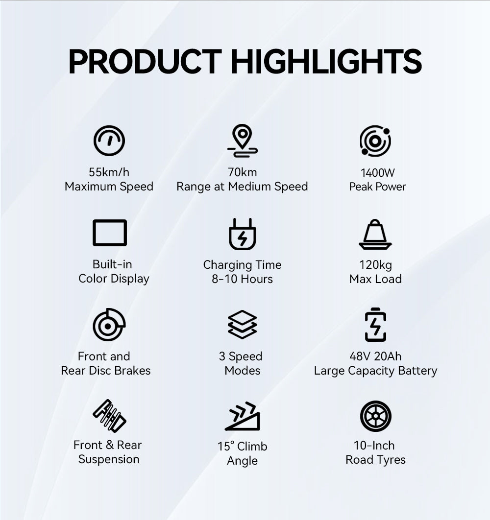 With its full aluminum alloy frame and ambient lighting design, OOTD S10 exudes a stylish and modern aesthetic, making you the center of attention in the city.