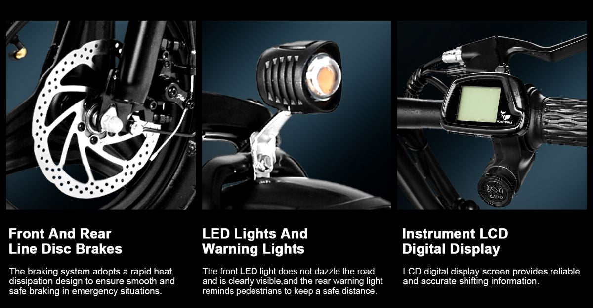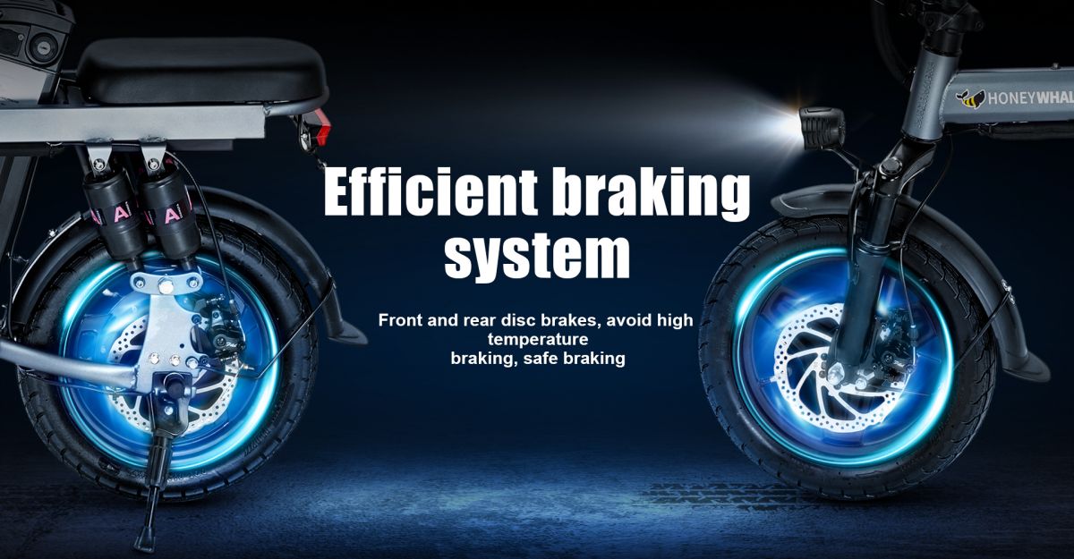 ▽Powerful Damping and Braking System▼ Honeywhale S6 Pro electric bike adopts disc brakes, combined with powerful damping system, making riding more stable and safer. The dual shock absorbers can effectively absorb 85% of the impact force, minimizing the jerky feeling in adverse road conditions.