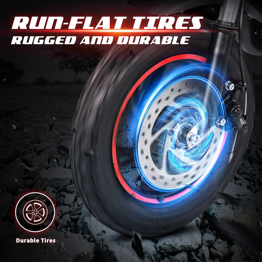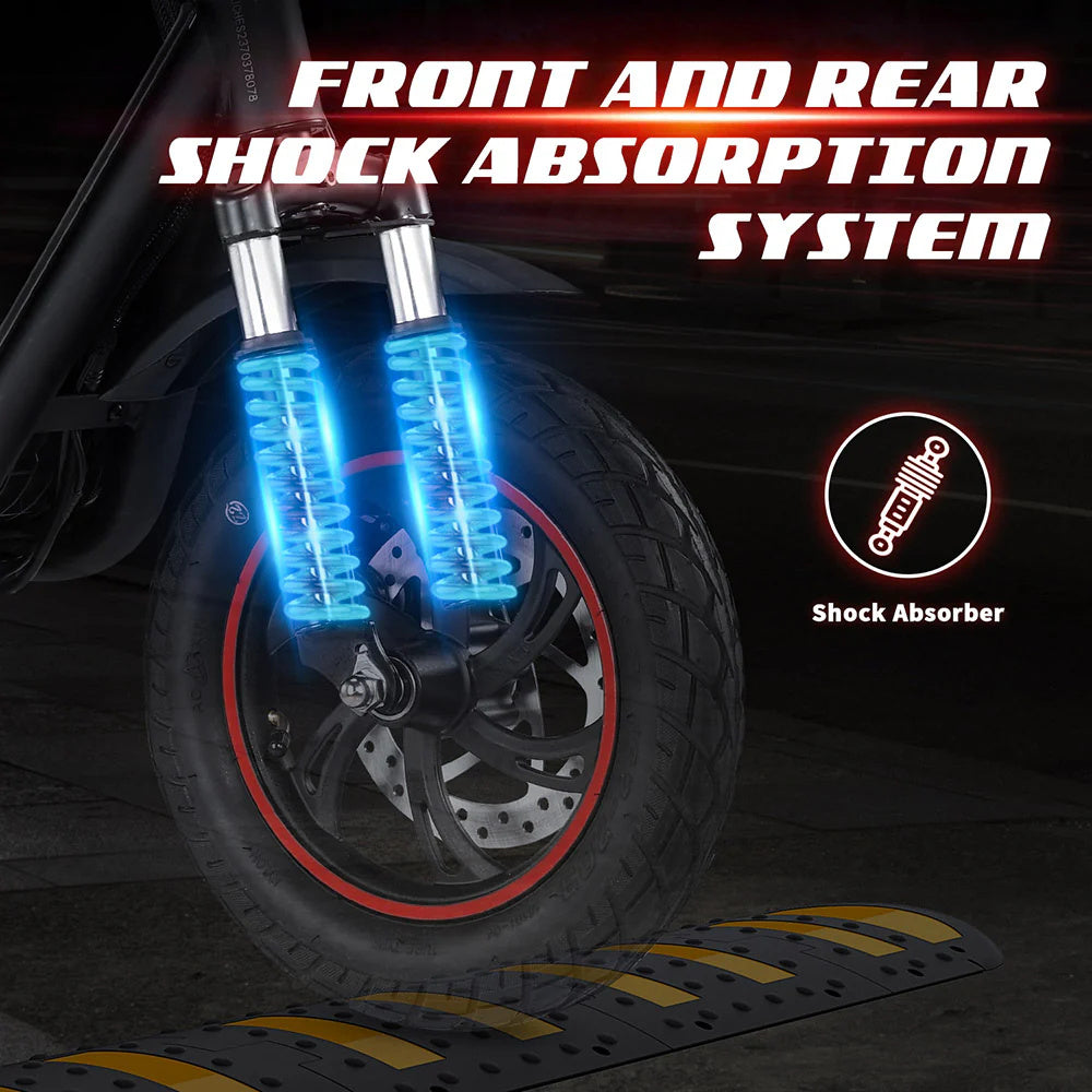 Folding electric scooter adopts 12-inch pneumatic tyres, which have high elasticity and abrasion resistance, and good adhesion and heat dissipation performance, without safety hazards. Foldable handlebar is easy to carry.
