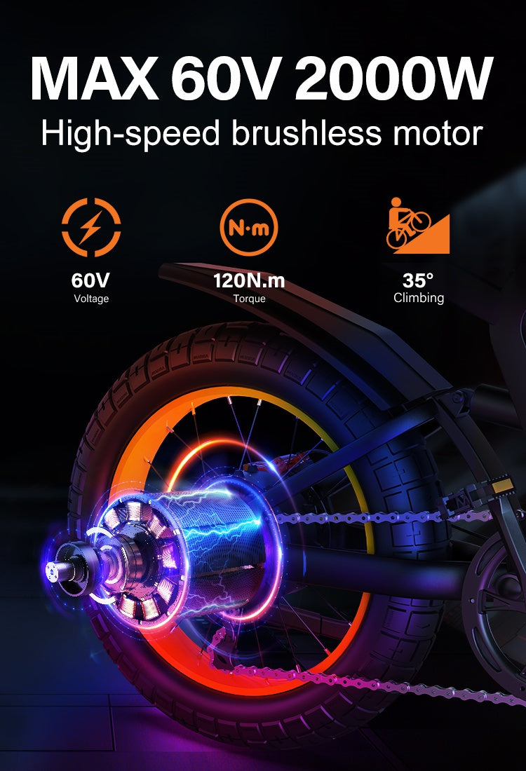 • Motor: 60V Peak 2000W (Rated 1500W) Brushless Rear Hub Motor 120N.m