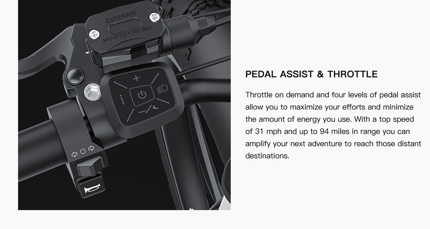 30-50+miles (48-80km) in Class-2 throttle-only mode (pure electricity); 70-87+miles (113-140km) in Class-1 PAS (pedal assist)