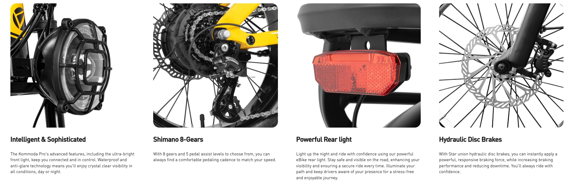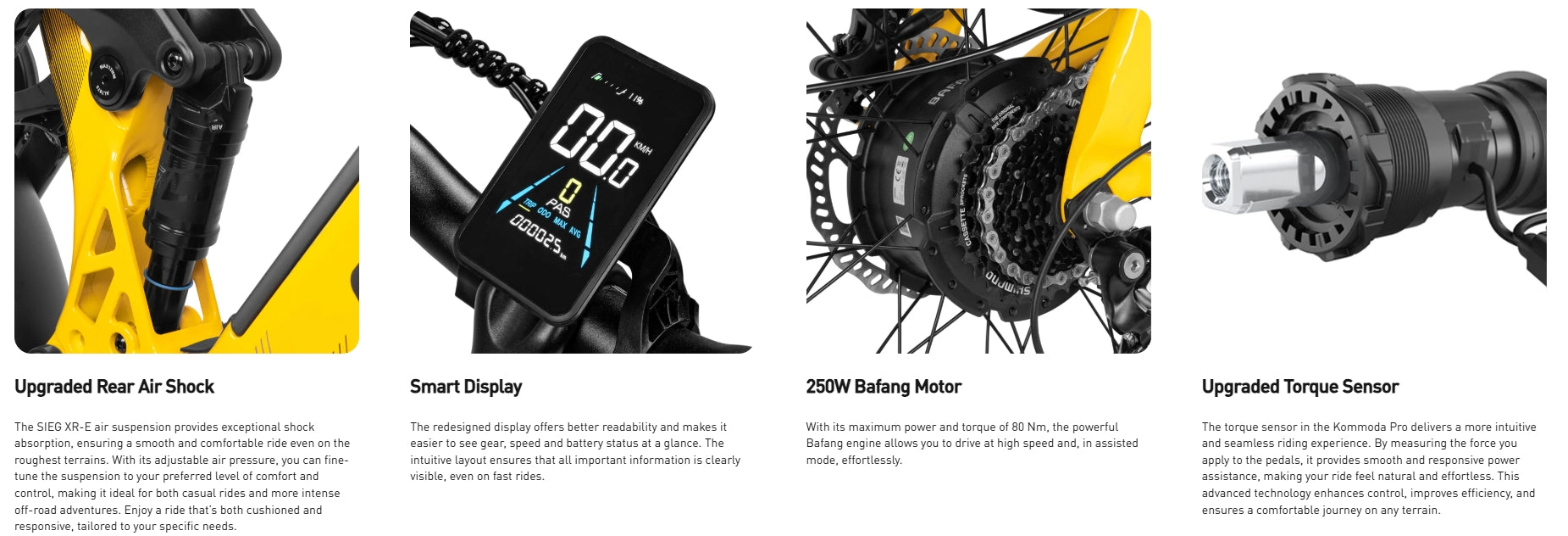 • The Kommoda Pro is a modern step-through e-bike equipped with a powerful 250W motor, torque sensor for smoother