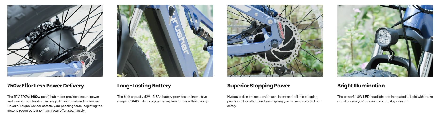 Experience the perfect blend of power, comfort, and versatility with the Rover E-Bike. Featuring a robust 750W hub motor, advanced torque sensor, hydraulic suspension, and a high-capacity 52V 15.6Ah battery, the Rover is designed for conquering any terrain with ease. With 26§x4.0§ fat tires, powerful hydraulic disc brakes, and a sleek aluminum frame, it ensures stability, safety, and style on every ride. Whether you*re navigating rugged trails or cruising city streets, the Rover delivers the performance and reliability you need for any adventure.