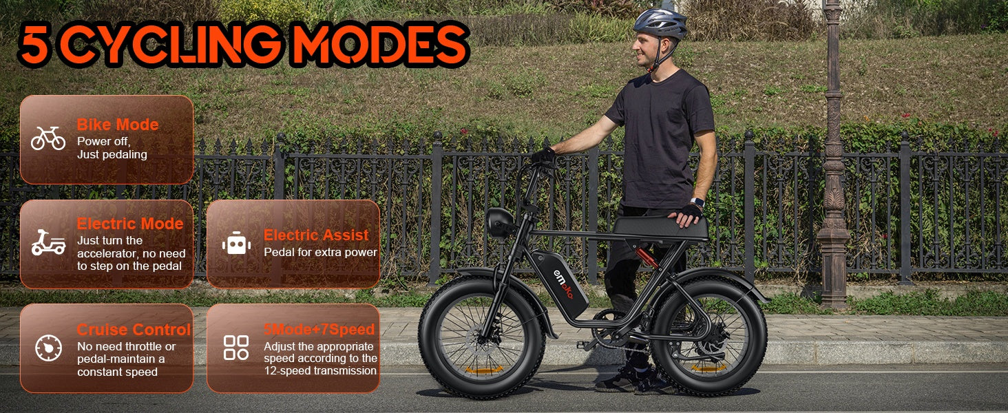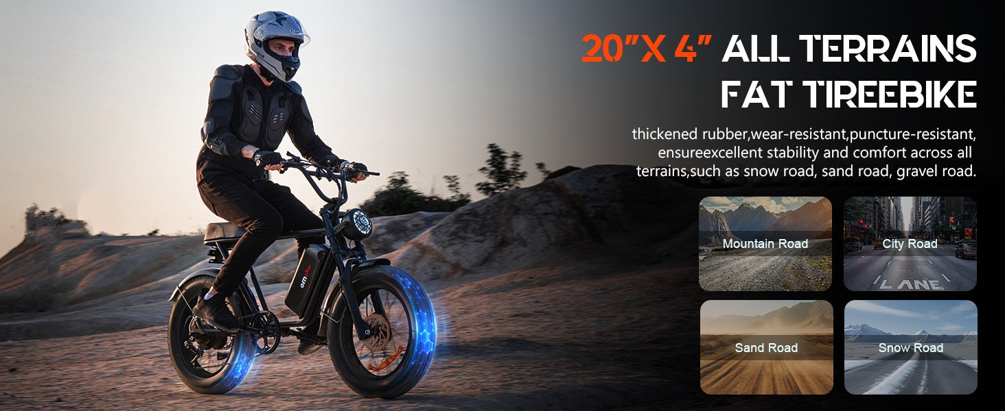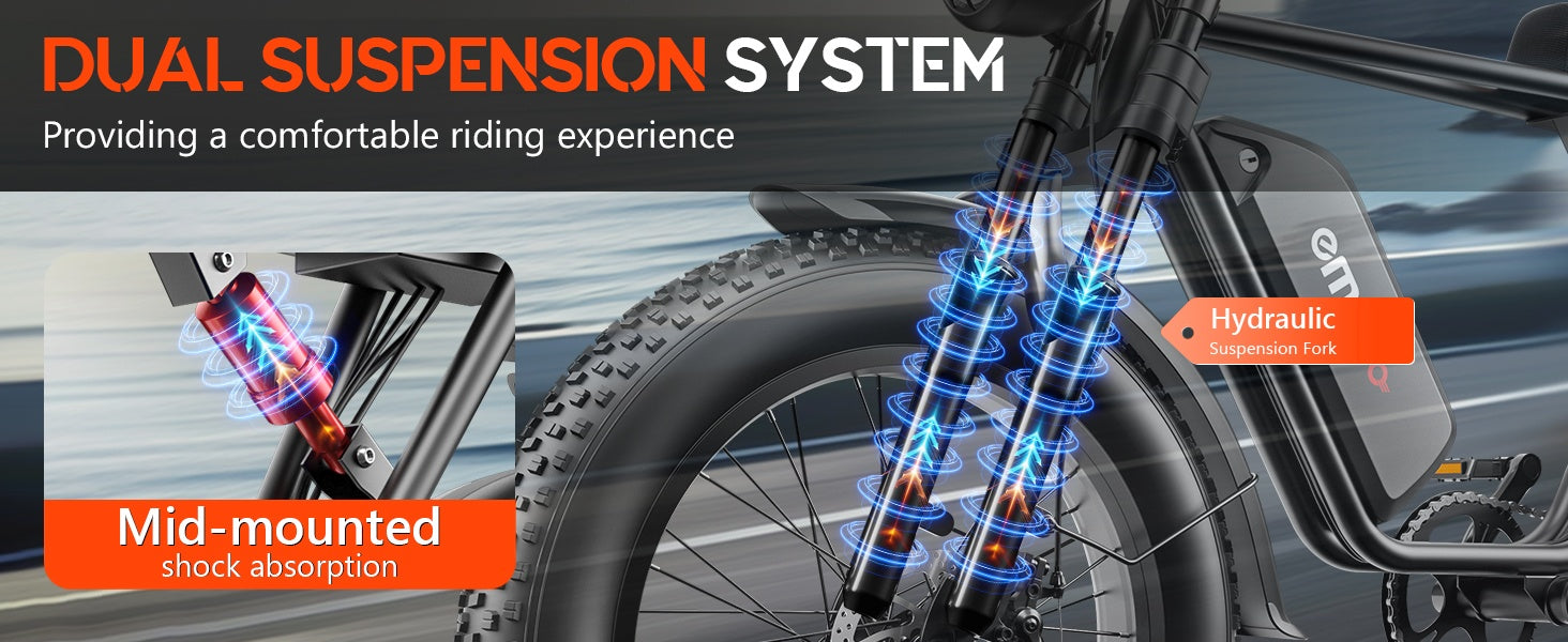 [ALL-TERRAIN ELECTRIC BIKE]This Emoko ebike is equipped with 20*4 inch wide tires, whether it is on the beach, snow, mountain, or asphalt road, it can be ridden in any road conditions, and is equipped with a thickened front fork shock absorber and a rear spring shock absorber under the seat, which not only provides stable grip and a comfortable riding experience, but also takes you unimpeded and experience every different journey!