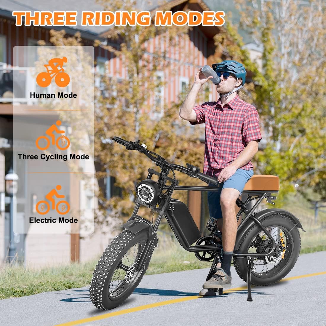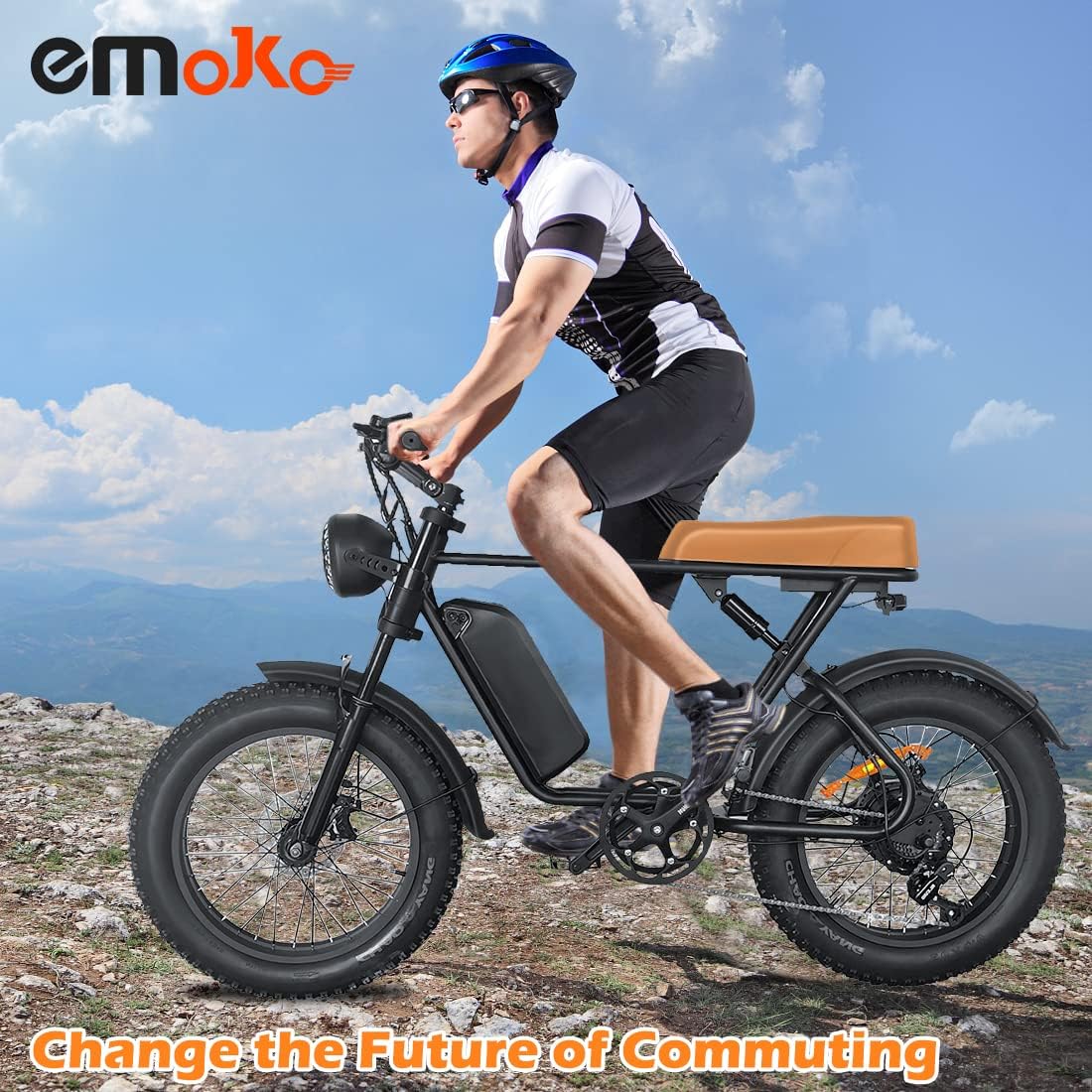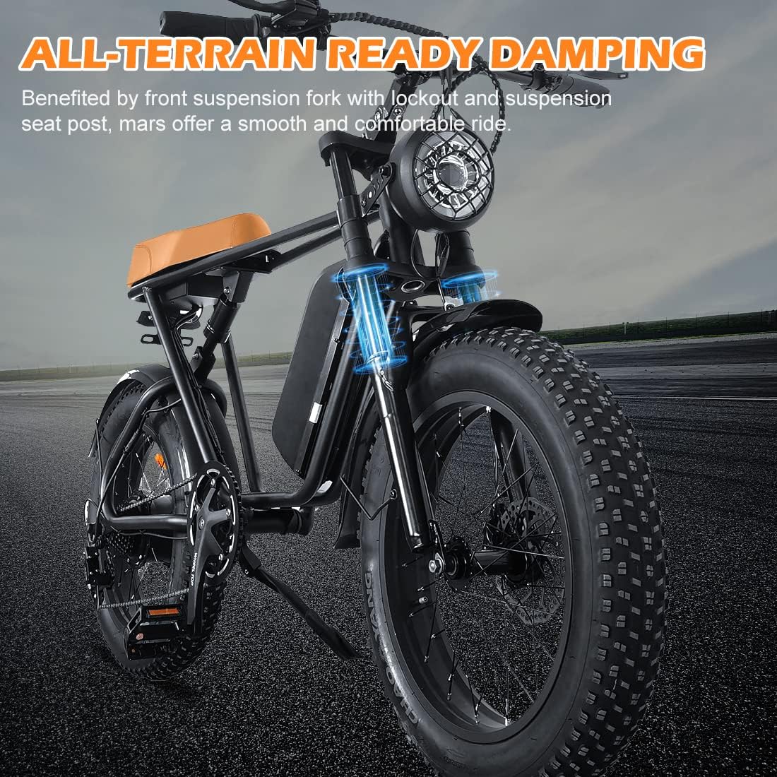 [ALL-TERRAIN ELECTRIC BIKE]This Emoko ebike is equipped with 20*4 inch wide tires, whether it is on the beach, snow, mountain, or asphalt road, it can be ridden in any road conditions, and is equipped with a thickened front fork shock absorber and a rear spring shock absorber under the seat, which not only provides stable grip and a comfortable riding experience, but also takes you unimpeded and experience every different journey!