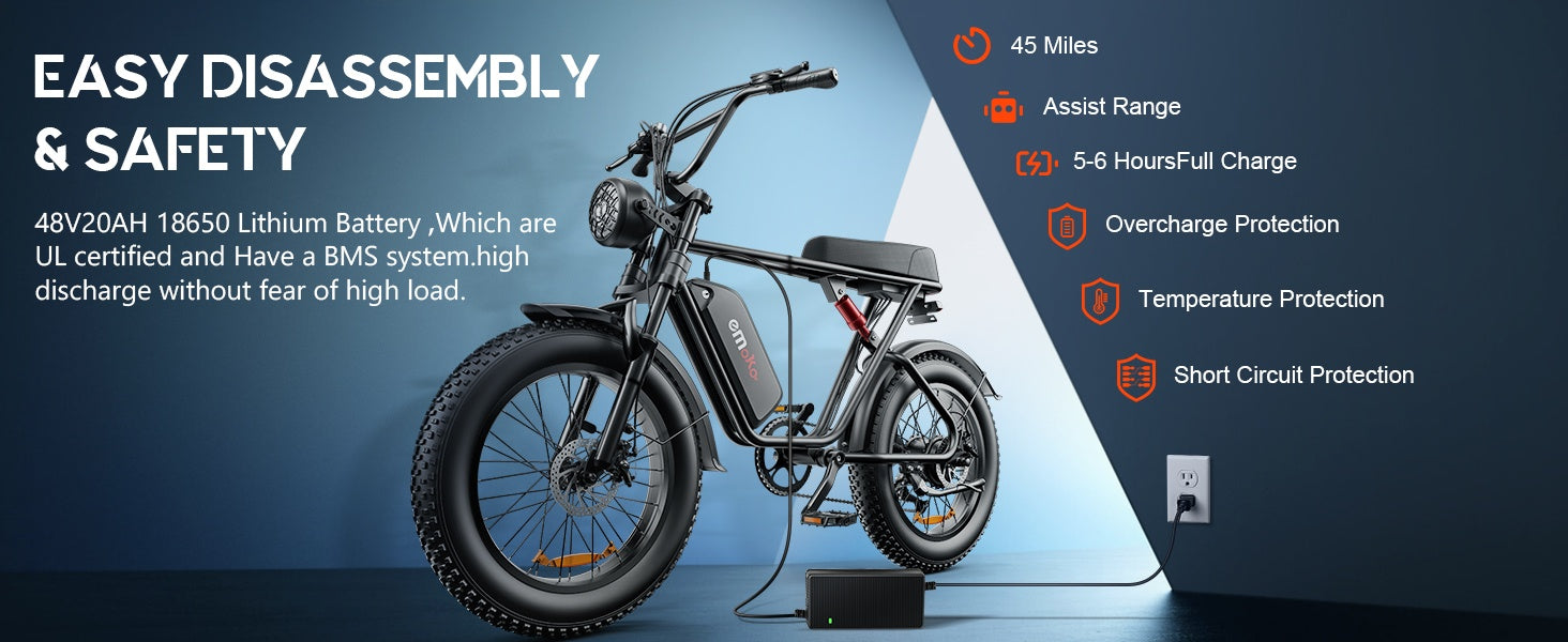 [1000W power gear motor] Emoko e-bike is equipped with a 1000W gear motor with a peak power of up to 1200W! The maximum speed can reach 30-35MPH, and it can easily take you uphill even a 35% high slope, giving you an exciting riding experience!
