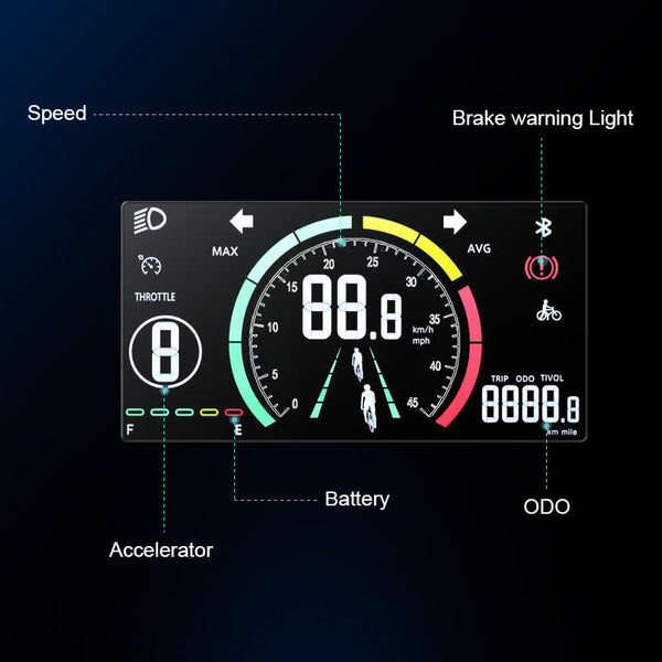 The LCD display on the e-bike clearly shows the speedbattery level, total range and riding mode.