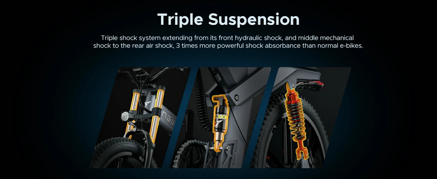 Full Suspension System & Variable Speed System :The full suspension ebike is perfect for heavy off-road or long downhill.Electric moped cycle bikes adopts lockable and adjustable double shoulder front suspension downhill fork and rear suspension.8-speed variable system allowing you to effortlessly switch gears to match your riding needs. Additionally, the step-up lectric bike is equipped with a gear sensor, providing added protection for both the E bicycle and gearbox.