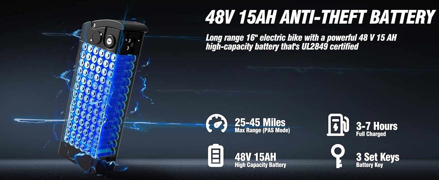 [HIGH CAPACITY BATTERY]48V 15AH ebike battery with 3A fast charger can be quickly recharged in 3 hours, providing you with up to 30-45km of power for your ride (pedal assist mode)