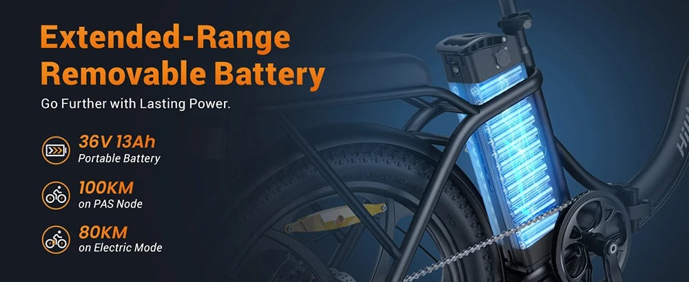 MilePort 1 electric mountain bike with 36V 13Ah battery, you can ride up to max 100km on a single charge in PAS mode and 80km on pure electric mode.