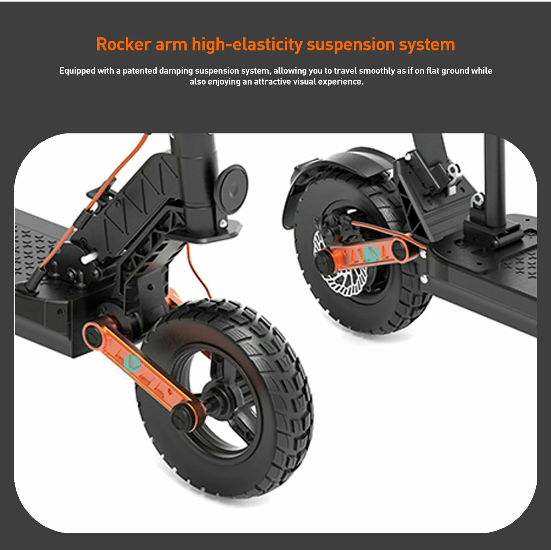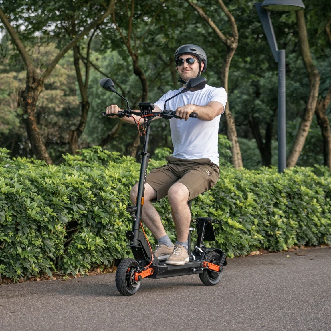 The Joyor S8E electric scooter combines high-quality riding comfort with advanced safety technology. The 10-inch all-terrain tires ensure a smooth ride on any surface, while the dual front and rear suspension effectively absorbs shocks. With hydraulic disc brakes on both wheels and an EU-compliant design that includes indicators, electric horn and rear-view mirror, you can be confident of your safety at all times. The scooter is also COC-certified and therefore approved for legal road use in the EU.