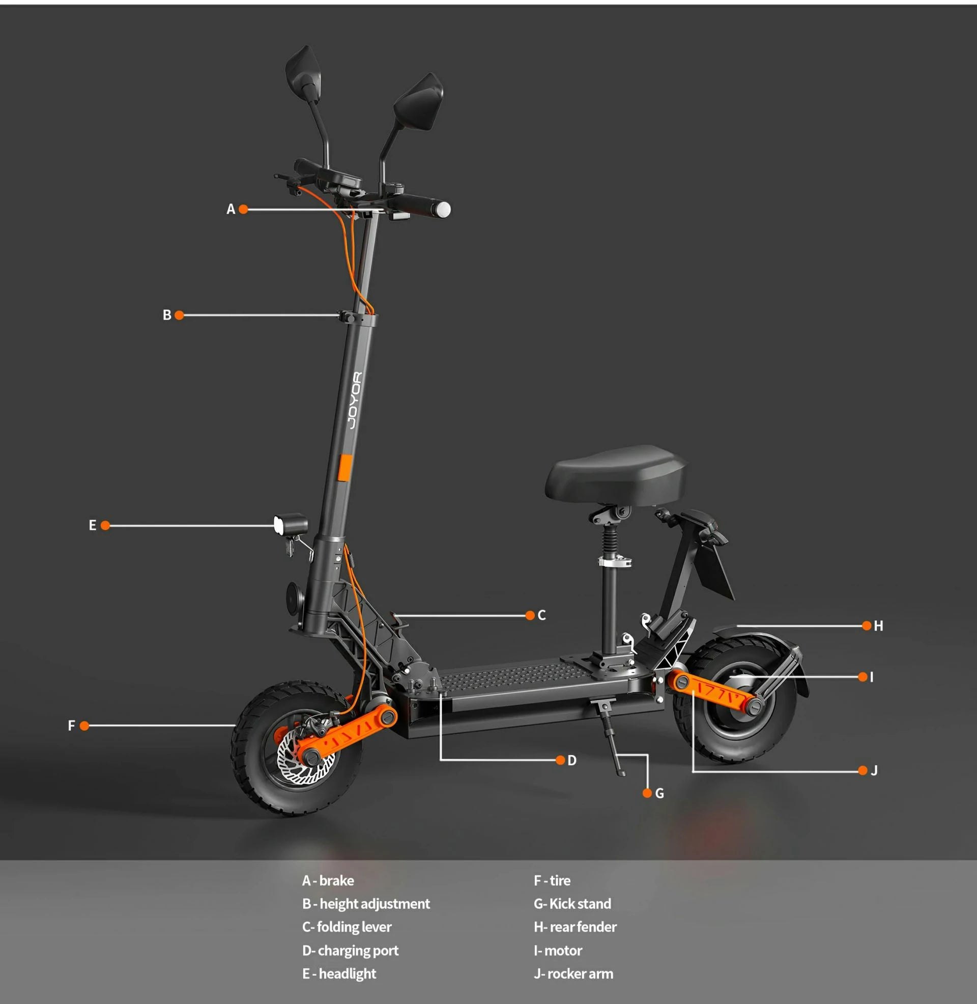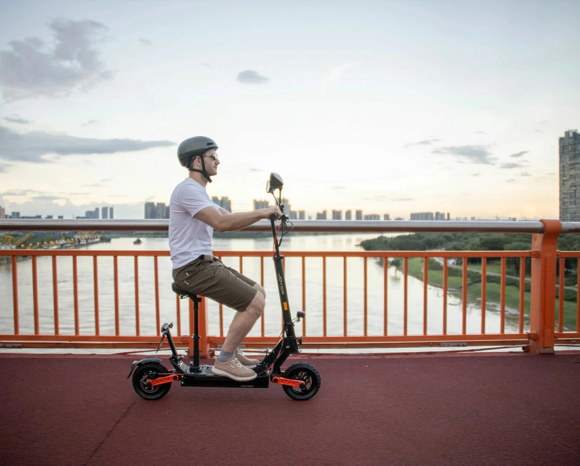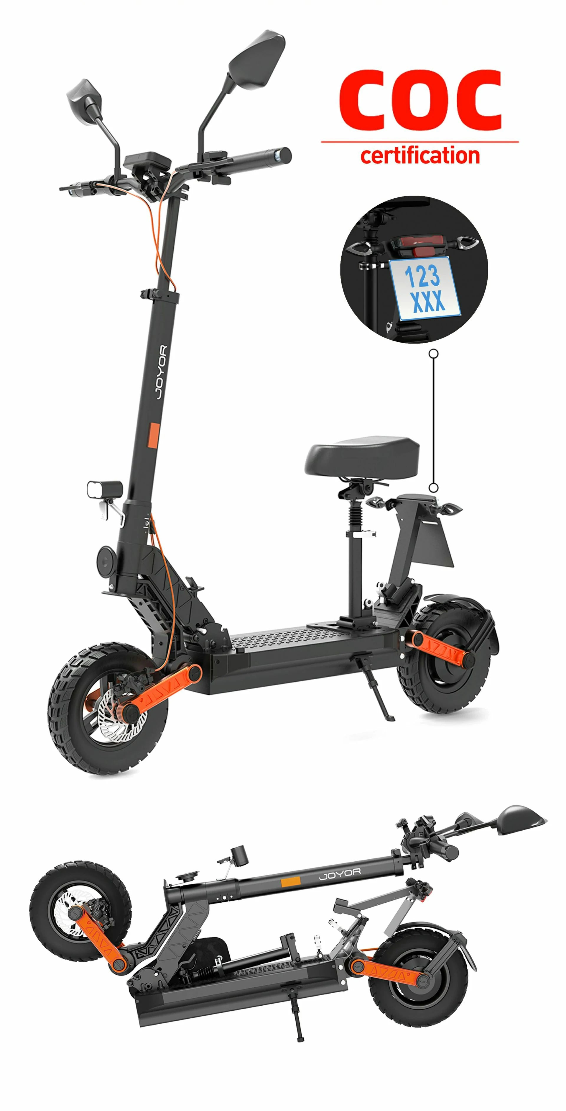 Thanks to its simple folding mechanism and compact dimensions, the Joyor S8E is easy to transport and store. The integrated LED front and rear lights and indicators increase your visibility and safety on every ride. The comfortable, foldable seat makes longer journeys pleasant, while the robust design allows a maximum load of up to 120 kg.