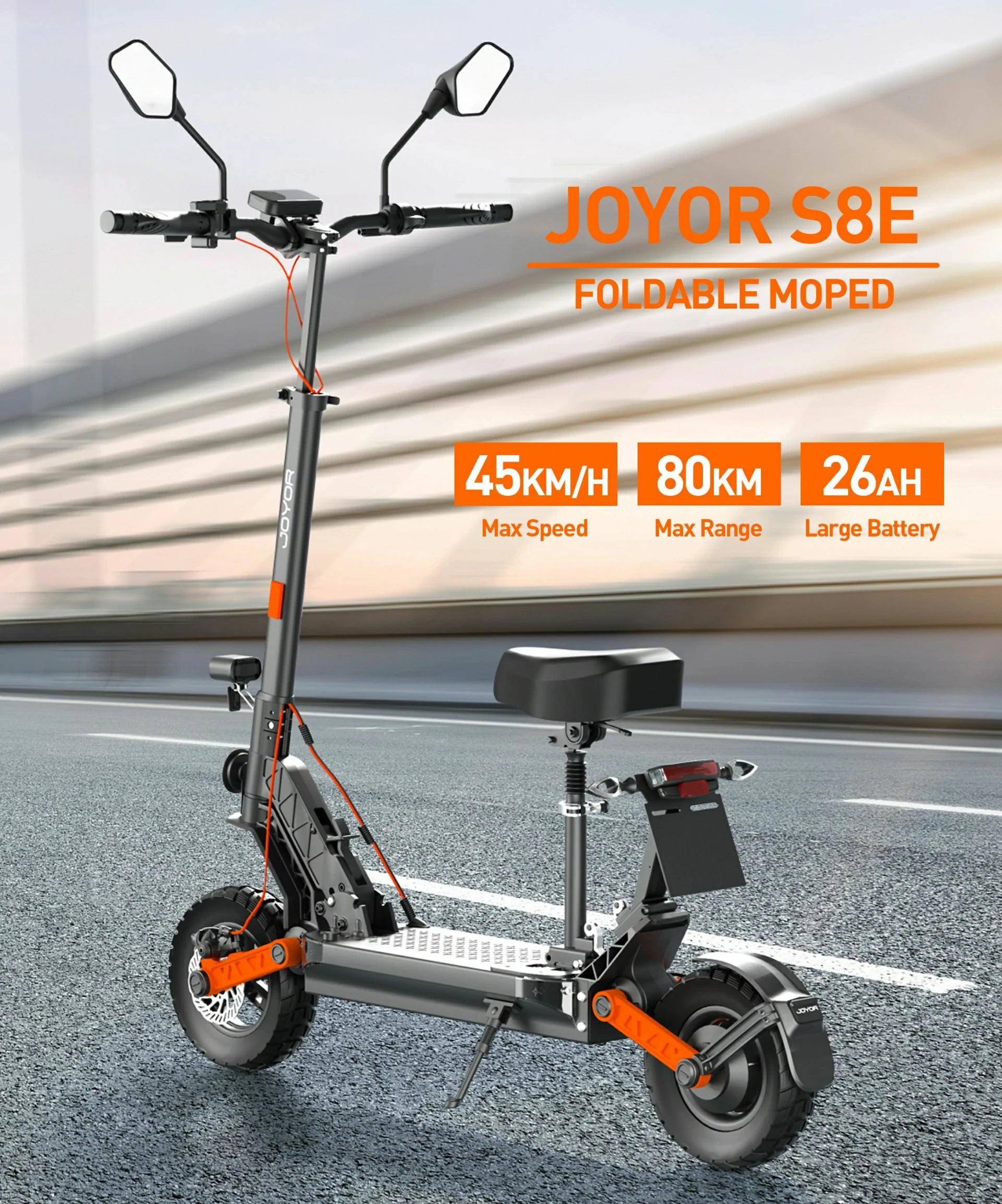 Discover the Joyor S8E e-scooter with seat - your ideal companion for daily journeys, both in the city and in the countryside. Equipped with a powerful 800W motor and a high-performance 48V-26AH battery, this scooter offers an impressive range of up to 80 km and reaches a top speed of 45 km/h. The foldable design and height-adjustable handlebars make the S8E extremely practical and versatile - perfect for stowing in the trunk or taking with you in the elevator.