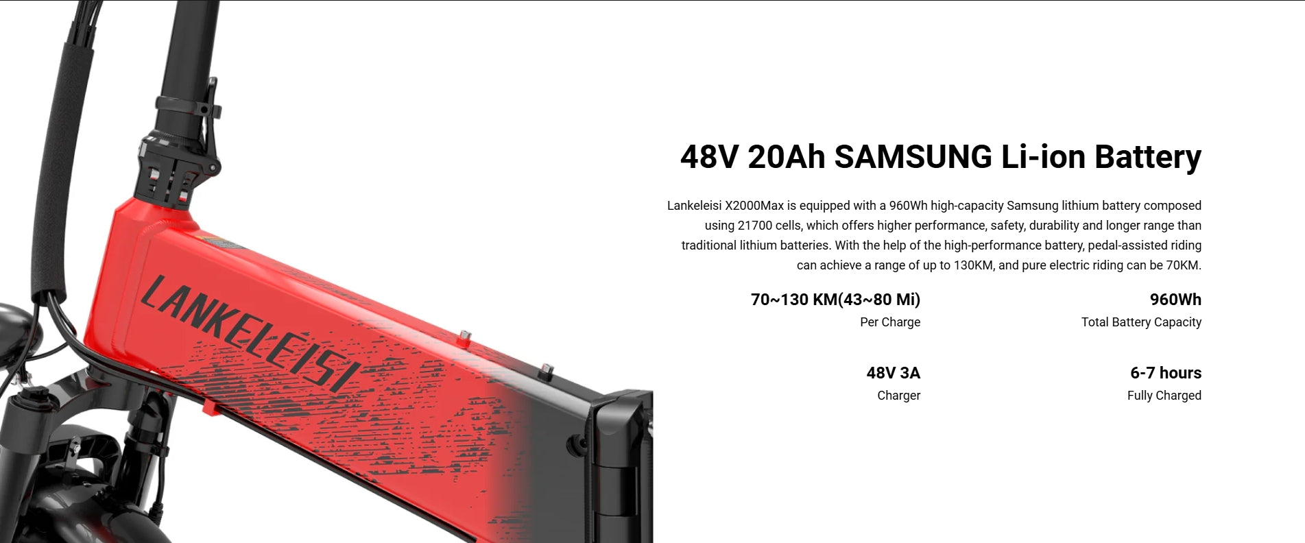 • Lithium Battery Energy Content:48V 20AH Samsung Lithium Battery
