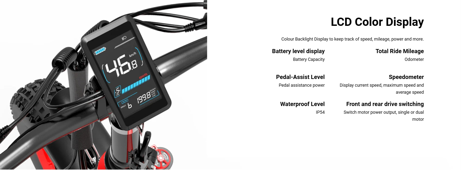 The 48V LED headlight and tail light ensure ridersafety in low light conditions or at night, allowingyou to see and be seen and ride safely.