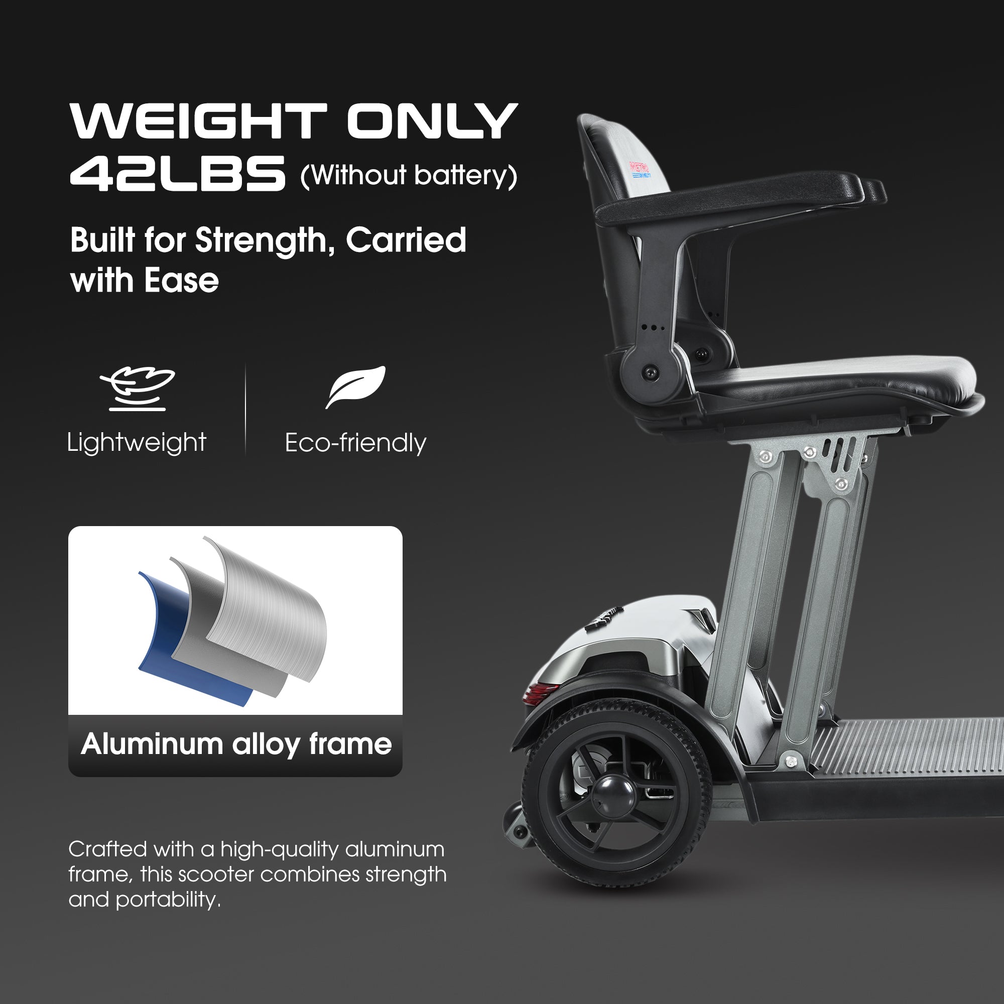 ?? 42LBS final part, aluminum alloy frame, seat folds in 1 second with one button, easy to put into car trunk.?