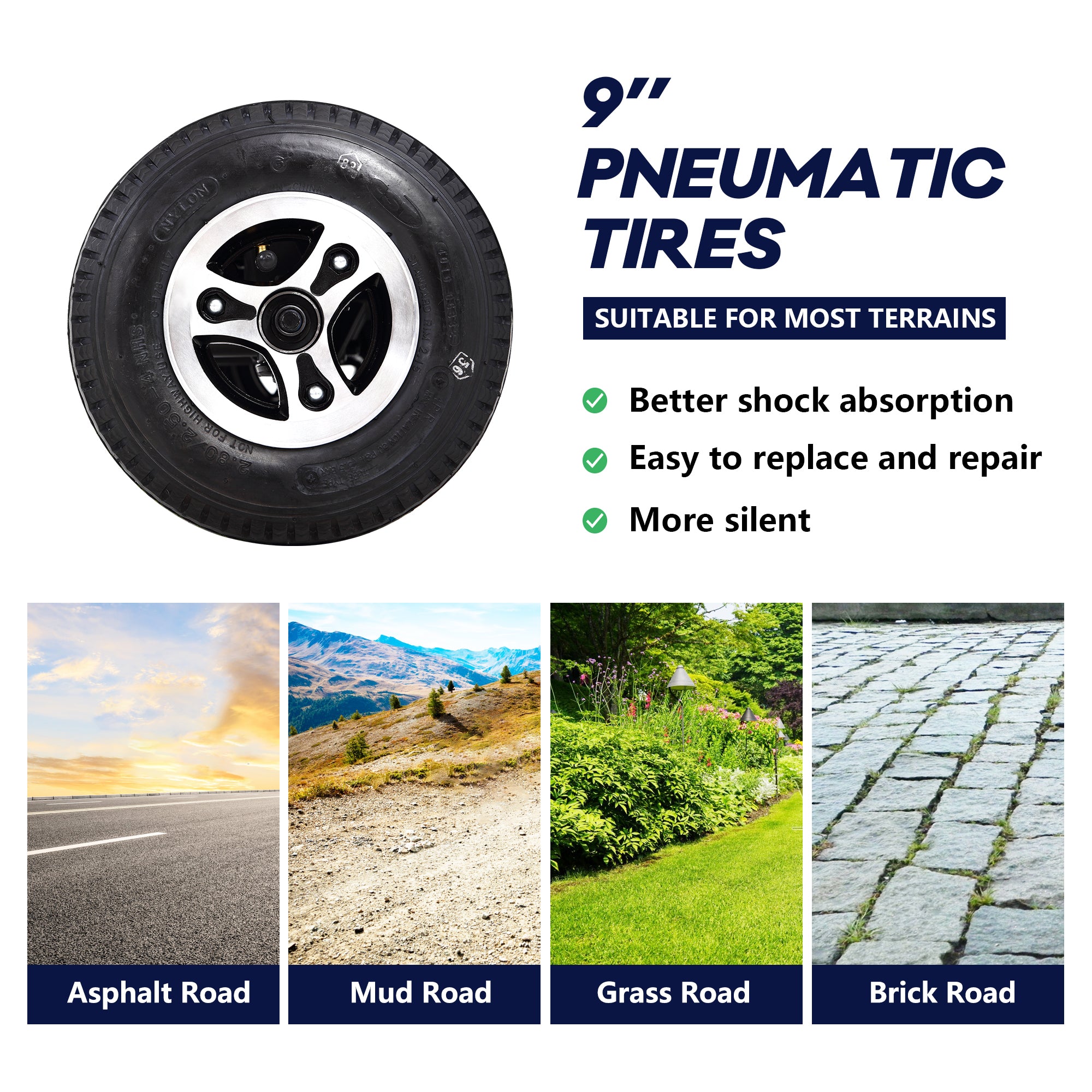 • Tire:9"x3"(Front) 9"x3"(Rear) Pneumatic Tires
