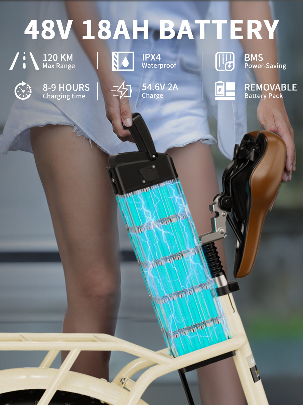 The 48V 18Ah large capacity battery ensures long-lasting rides, so you can enjoy your trips without worrying about frequent recharging.