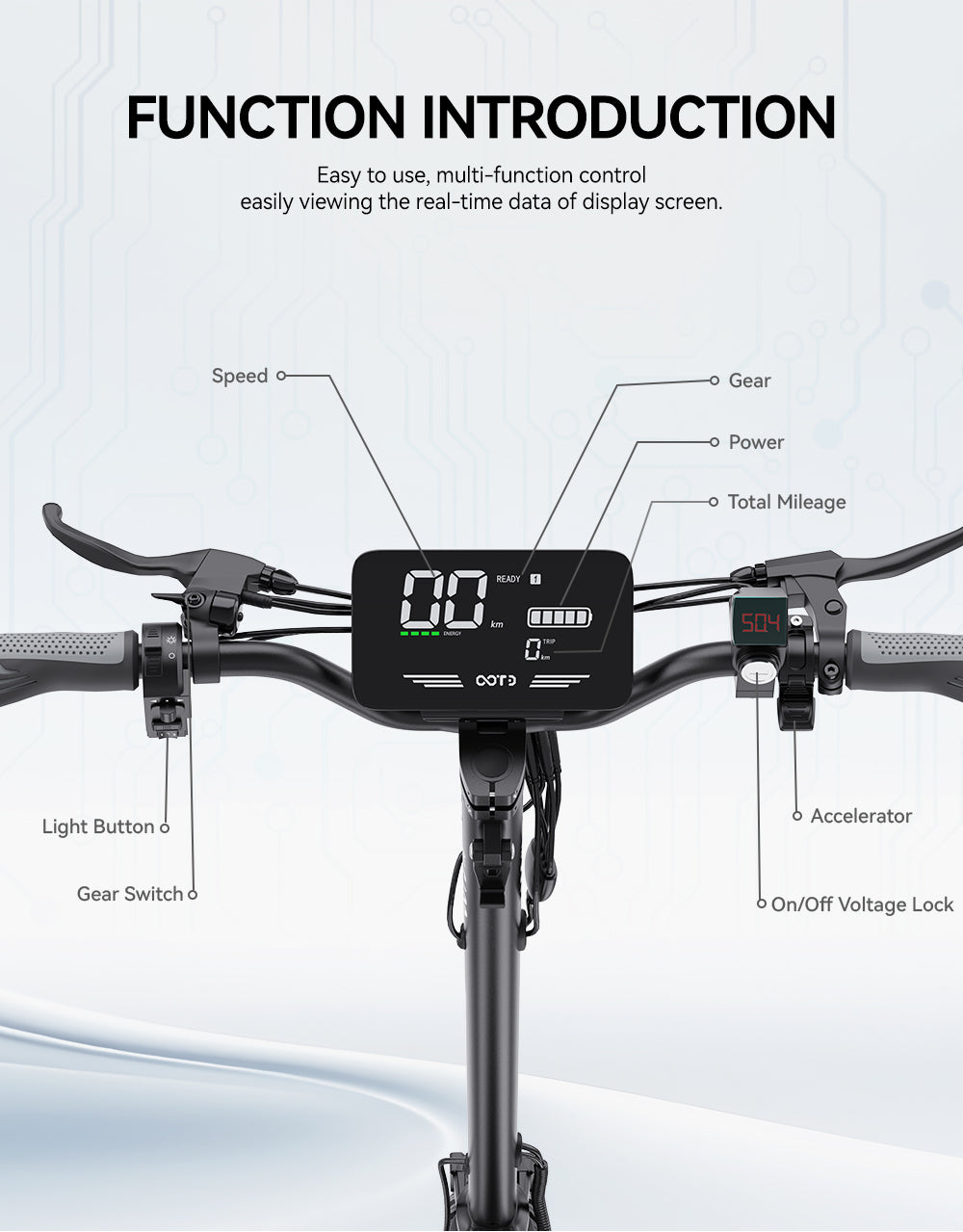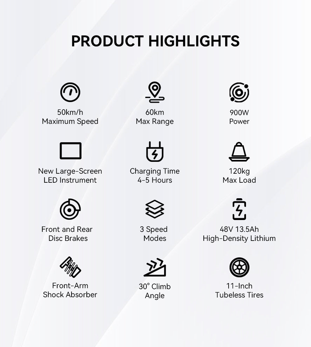 Equips a 500W high-efficiency motor (peak 900W) that easily climbs 30~ slopes (equivalent to underground garage gradients). Features Eco/Low/High 3-speed modes with a max speed of 60km/h, meeting energy-saving commutes, city rides, and racing needs. Energy output efficiency is 27% higher than similar products.
