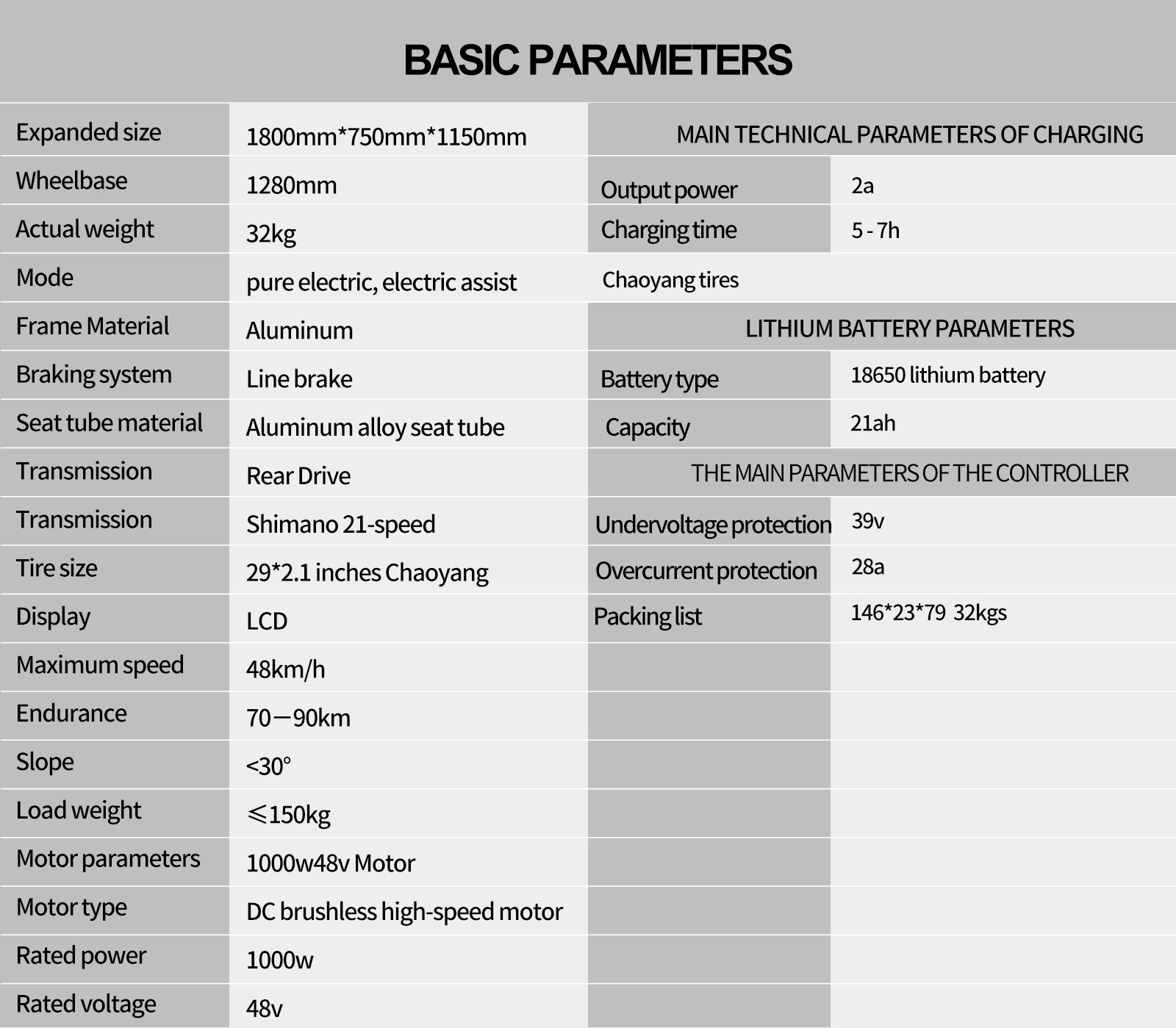 • Tire size: 29 ℅ 2.1 inches (Chaoyang)