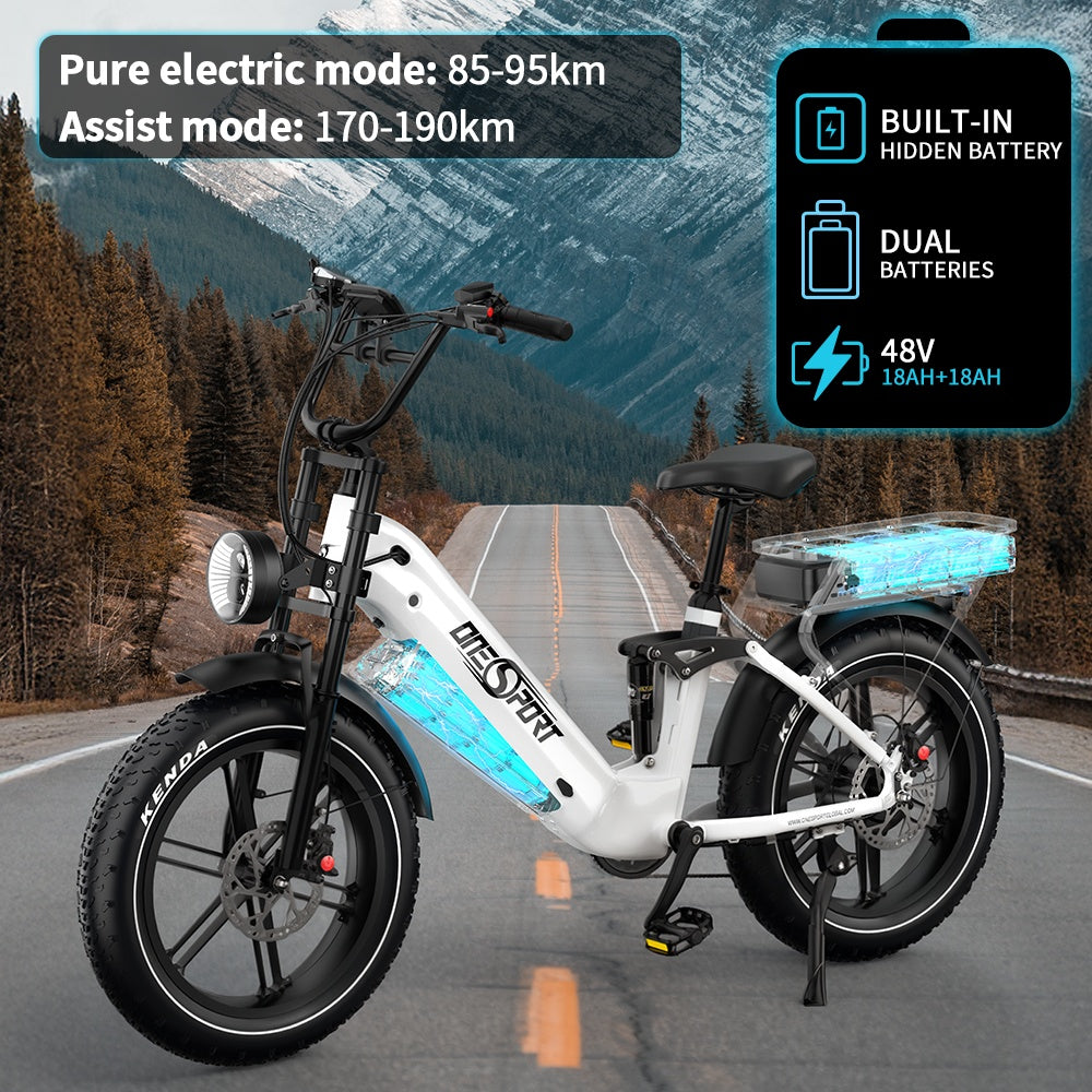 The OT08Pro full suspension ebike features a dual-battery system, combining a frame-integrated battery with a rear rack battery for extended range and superior performance. This design provides longer rides, increased power, and enhanced reliability, making it perfect for both daily commutes and long-distance adventures. With the dual battery setup, you can enjoy more mileage per charge while maintaining a balanced and stable ride.